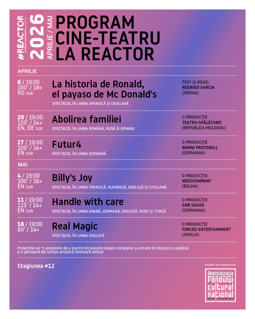 Fiecare proiecție va fi urmată de o discuție cu publicul, la care va participa (online) și un membru al echipei sau companiei artistice invitate.