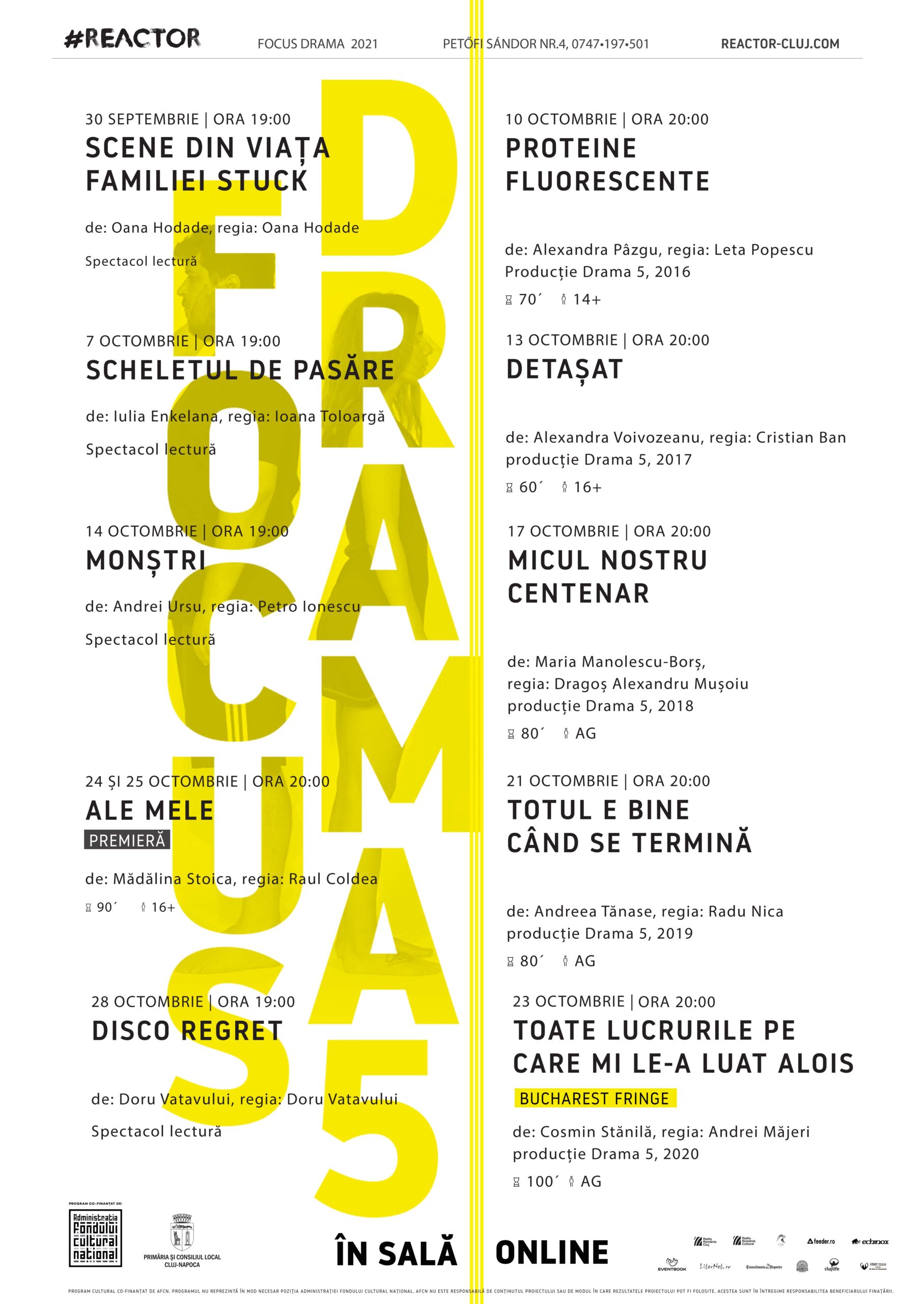 Luna octombrie este Luna Drama 5 la Reactor. Rezidența de scriere dramatică Drama 5, aflată anul acesta la a șasea ediție, este un important program al spațiului Reactor, care a produs din 2016 până în prezent 32 de piese noi de teatru, 6 spectacole, 5 volume online (cu al șaselea plănuit să apară toamna aceasta) și 27 de spectacole-lectură. Piesele scrise în cadrul Drama 5 au fost montate și premiate în numeroase alte teatre din țară.
